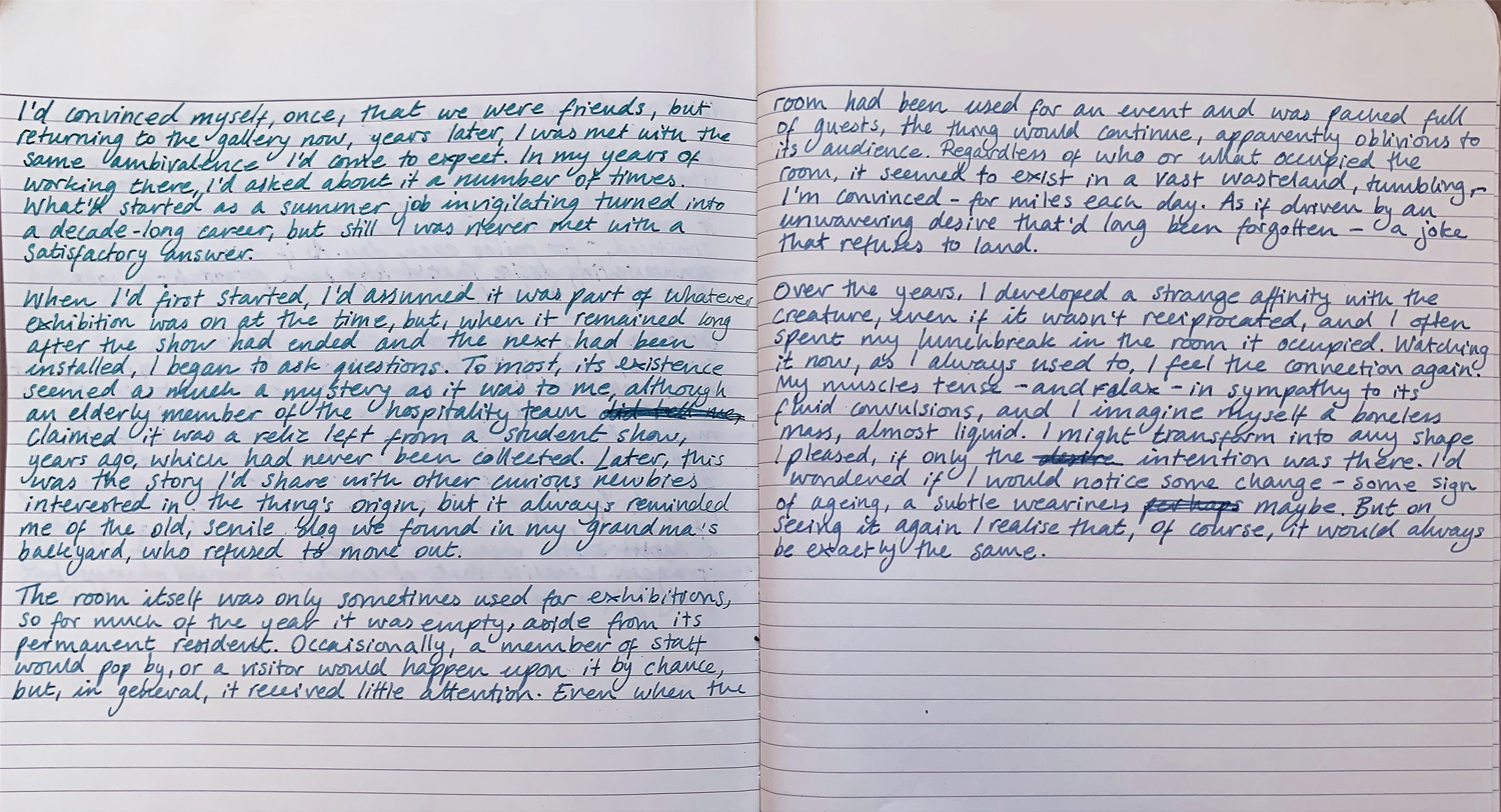 Over the years, I developed a strange affinity with the creature, even if it wasn’t reciprocated, and I often spent my lunch break in the room it occupied. Watching it now, as I always used to, I feel the connection again. My muscles tense – and relax – in sympathy to its fluid convulsions, and I imagine myself a boneless mass, almost liquid. I might transform into any shape I pleased, if only the intention was there. I’d wondered if I would notice some change – some sign of ageing, a subtle weariness maybe. But on seeing it again I realise that, of course, it would always be exactly the same.